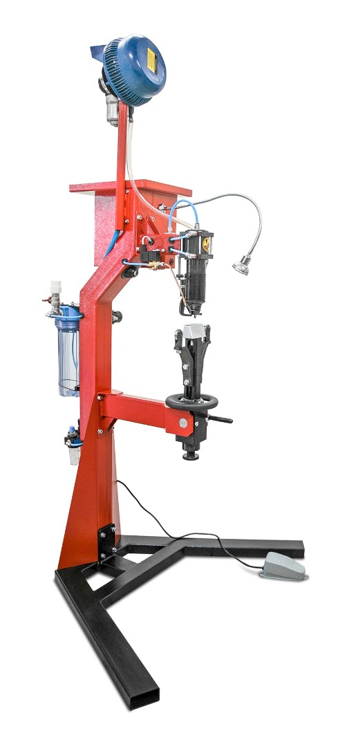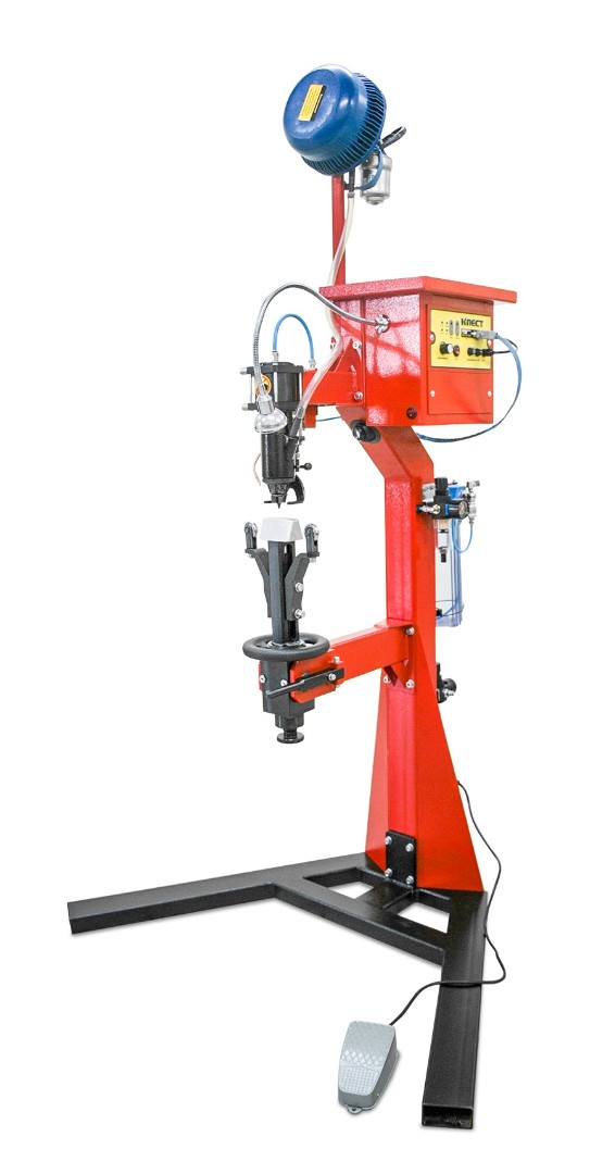 Установлена штоковая головка с модернизированным механизмом подачи шипа. Шипоподающее устройство правильно ориентитует шипы и подает их в шипопровод. Регулируемая конструкция рабочего стола обеспечивает правильное расположение шипуемых покрышек разных типоразмеров. Имеется удобная подсветка рабочей зоны. Вылет шипа регулируется вне зависимости от высоты протектора. Улучшена конструкция впрыска смазывающей жидкости. Возможна точная регулировка темпа работы полуавтомата. Управление рабочим циклом осуществляется при помощи ножной педали.