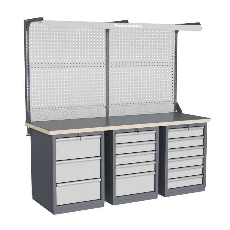 Верстак может комплектоваться одинарным или двойным перфорированным экраном, электромонтажным блоком для установки розеток и дополнительных устройств, а также комплектом освещения с держателем и лампой. Перфорация экрана подходит под стандартные держатели для инструментов, отверток, крючков, полок. Возможна комплектование верстака навесным элементами (держатели, крючки, полки).